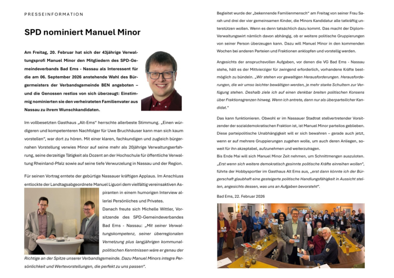 am 20. Februar 2026 nominierten mich die Mitglieder der SPD innerhalb der Verbandsgemeinde Bad Ems - Nassau im Gasthaus "Alt Ems" zum Kandidaten für die Wahl des Bürgermeisters der Verbandsgemeinde. Das ist eine schöne Bestätigung für mein bisheriges berufliches Wirken in Landes- und Kommunalbehörden sowie als gewähltes Mitglied des Stadtrats von Nassau. Dort bin ich 1983 geboren und aufgewachsen - zusammen mit meiner Frau Sarah und unseren vier Kindern wohne ich im Ortsteil Scheuern.