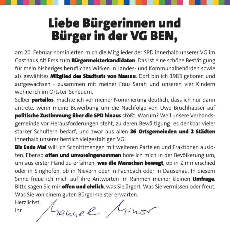 am 20. Februar 2026 nominierten mich die Mitglieder der SPD innerhalb der Verbandsgemeinde Bad Ems - Nassau im Gasthaus "Alt Ems" zum Kandidaten für die Wahl des Bürgermeisters der Verbandsgemeinde. Das ist eine schöne Bestätigung für mein bisheriges berufliches Wirken in Landes- und Kommunalbehörden sowie als gewähltes Mitglied des Stadtrats von Nassau. Dort bin ich 1983 geboren und aufgewachsen - zusammen mit meiner Frau Sarah und unseren vier Kindern wohne ich im Ortsteil Scheuern.