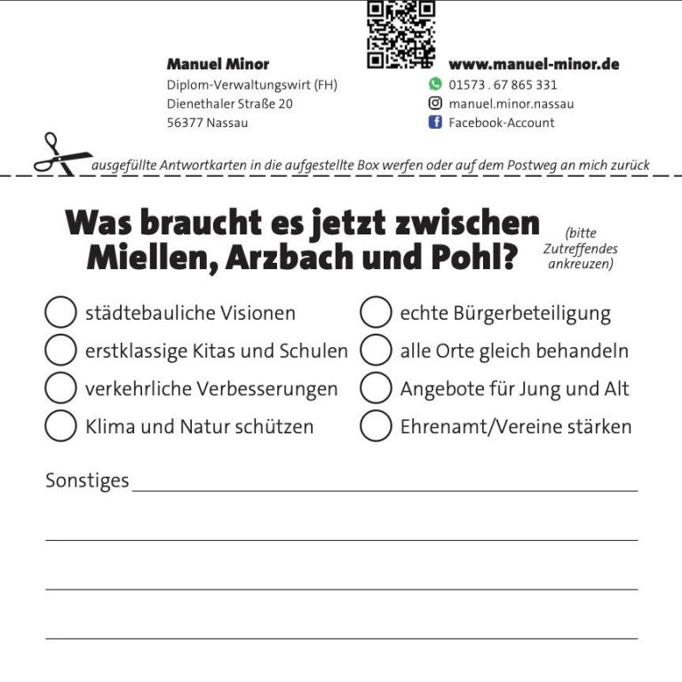 Bis Ende Mai will ich Schnittmengen mit weiteren Parteien und Fraktionen ausloten. Ebenso offen und unvoreingenommen höre ich mich in der Bevölkerung um, um aus erster Hand zu erfahren, was die Menschen bewegt, ob in Zimmerschied oder in Singhofen, ob in Nievern oder in Fachbach oder in Dausenau. In diesem Sinne freue ich mich auf ihre Antworten im Rahmen meiner kleinen Umfrage. Bitte sagen Sie mir offen und ehrlich, was Sie ärgert. Was Sie vermissen oder freut. Was Sie von einem guten Bürgermeister erwarten.